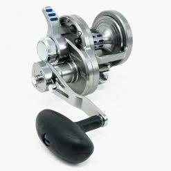 Daiwa 2020 Saltiga 2-Speed Lever Drag Reels are available in seven sizes. They are silver with blue accents.