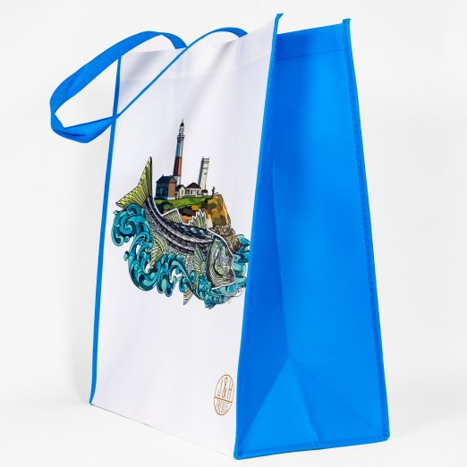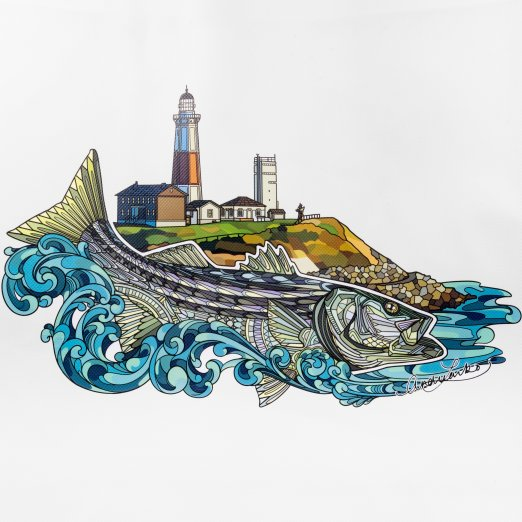 Probably the last thing you thought your favorite tackle shop would come out with would be a shopping bag but we did it! The J&H Tackle Montauk Lighthouse Reusable Shopping Bag replaces plastic bags and is perfect for carrying lots of stuff from J&H Tackle or the supermarket to your car. On both sides is an amazing zentangle image of a striped bass in front of the Montauk Lighthouse. This is one of our favorite pieces of art and it looks great on the shopping bag. The front and back are white while the sides are ocean blue. We made sure there are long handles making it more comfortable to carry.Â