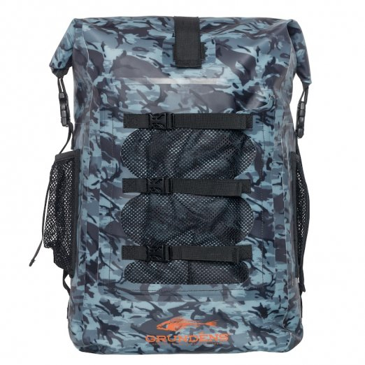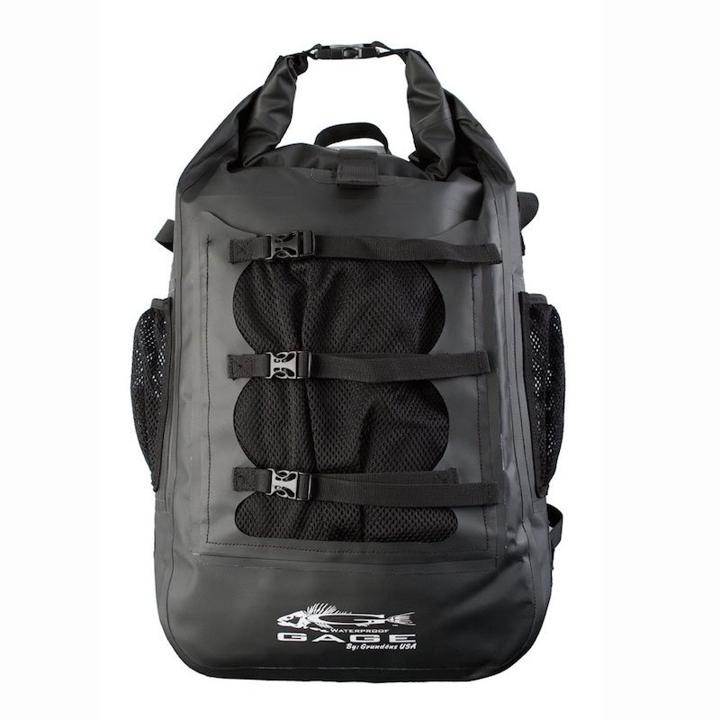 The Grundens GAGE 30 Liter Rum Runner Waterproof Backpack is a great fishing bag! Constructed of 500d tarpaulin fabric, this backpack can take some punishment and keep on going. It is 100% waterproof with a roll to closure and 100% radio frequency welded seams. Water will not get inside this bag! The Rum Runner holds a lot of gear. Fill it with clothing, fishing tackle, electronics, food or anything else you want to keep dry. The straps on this bag are thick and padded. The back panel is constructed of moisture wicking material. There is a water bottle holder on both sides of the bag and a large mesh pocket on the front. The Grundens GAGE 30 Liter Rum Runner Waterproof Backpack is extremely versatile and is perfect for your next fishing adventure, whether you are hiking through the woods or just going on a boat.Â